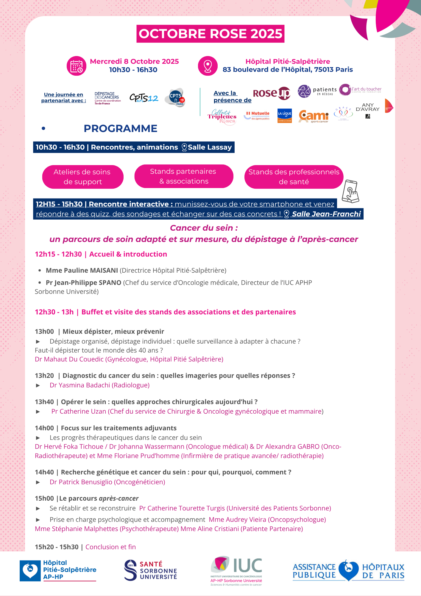 L’Hôpital Pitié-Salpêtrière se mobilise pour Octobre Rose 2025 à travers plusieurs rendez-vous de prévention, d’information et de sensibilisation, ouverts à toutes et tous.